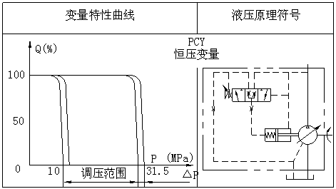 這種變量型式的泵,輸出壓力小于調定恒壓力時,全排量輸出壓力油,即定量輸出,在輸出油液的壓力達到調定壓力時,就自動地調節(jié)泵流量,以保證恒壓力,滿足系統(tǒng)的要求。泵的輸出恒壓值,根據(jù)需要,在調壓范圍內可以無級調定,泵的結構見圖6,該結構將輸出的壓力油同時通至變量活塞下腔和和恒壓閥的控制油入口,當輸出壓力小于調定恒壓力時,作用在恒壓閥芯上的油壓推力小于調定彈簧力,恒壓閥處于開啟狀態(tài),壓力油進入變量活塞上腔,變量活塞壓在最低位置,泵全排量輸出壓力油; 當泵在調定恒壓力工作時,作用在恒壓閥芯上的油壓推力等于調定彈簧力,恒壓閥的進排油口同時處于開啟狀態(tài),使變量活塞上下腔的油壓推力相等,變量活塞平衡在某一位置工作,若液壓阻尼(負載)加大,油壓瞬時升高,恒壓閥排油口開大、進油口關小,變量活塞上腔比較下腔壓力降低、變量活塞向上移動,泵的流量減小,直至壓力下降到調定恒壓力,這時變量活塞在新的平衡位置工作。反之,若液壓阻尼(負載)減小,油壓瞬時下降,恒壓閥進油口開大,排油口關小,變量活塞上腔比較下腔油壓升高,變量活塞向下移動,泵的流量增大,直至壓力上升至調定恒壓力。