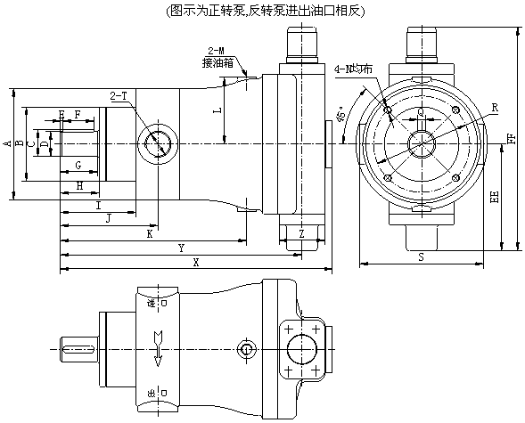 主體部分(參見結構剖)由傳動軸帶動缸體旋轉,使均勻分布在缸體上的七個柱塞繞傳動軸中心線轉動,通過中心彈簧將柱滑組件中的滑靴壓在變量頭(或斜盤)上。這樣,柱塞隨著缸體的旋轉而作往復運動,完成吸油和壓油動作。
